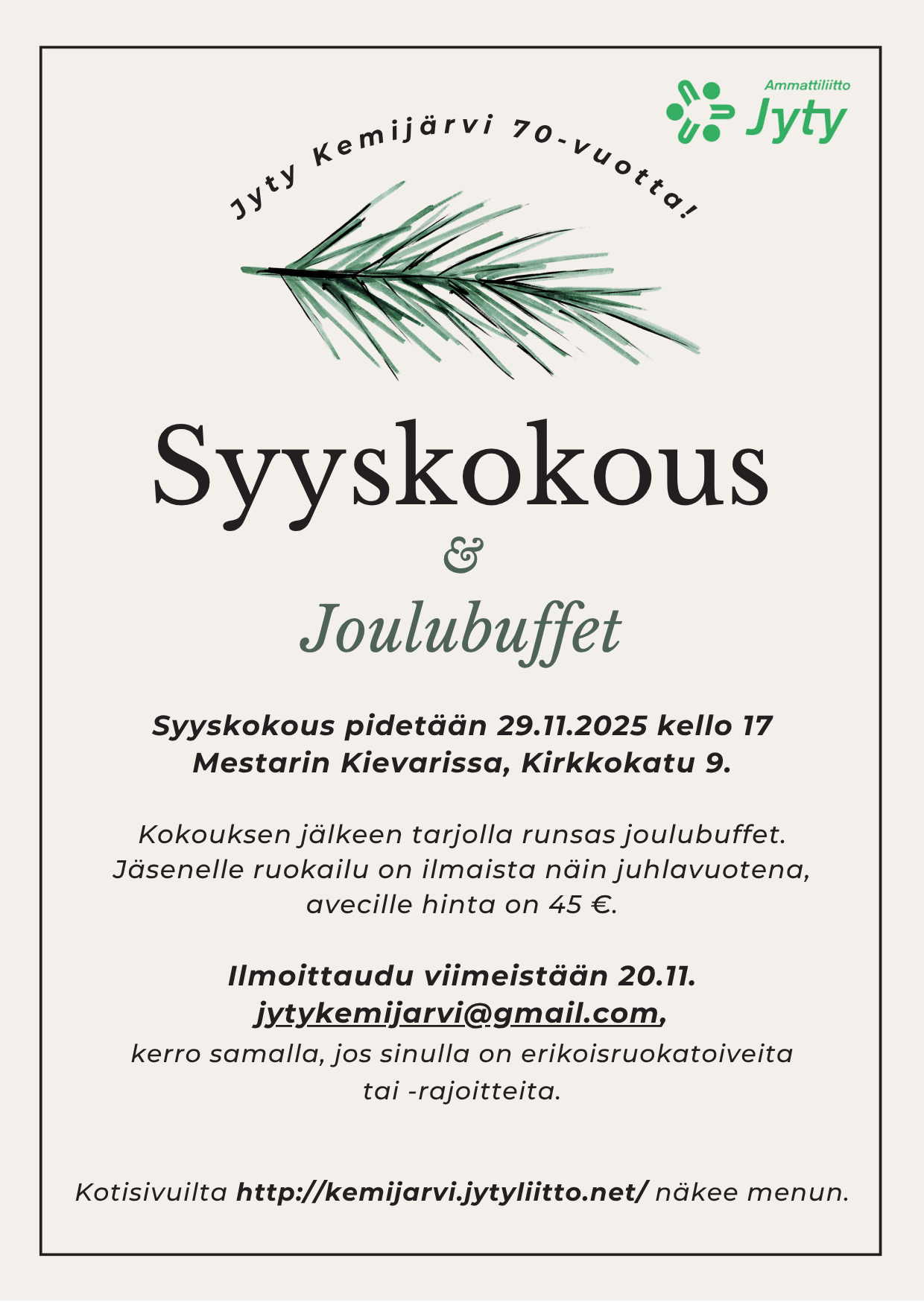 Ilmoittaudu jytykemijarvi@gmail.com viimeistään 30.10.