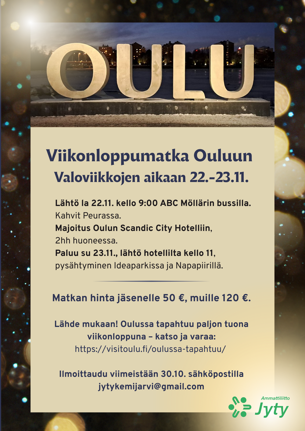 Jäsenelle matka 50 €, muille 120 €. Mennään Möllärillä, lähtö kello 9 ABC. Yöpyminen Scandic City Oulu, 2hh.